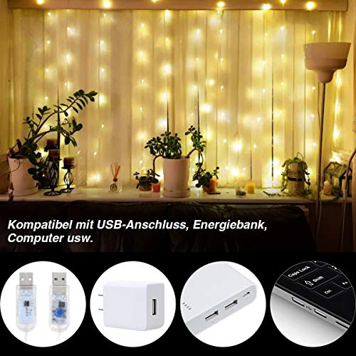 Anpro LED USB Lichtervorhang 3m x 3m, 300 LEDs USB Lichterkettenvorhang mit 8 Lichtmodelle für Partydekoration deko schlafzimmer, Innenbeleuchtung, Warmweiß – 4